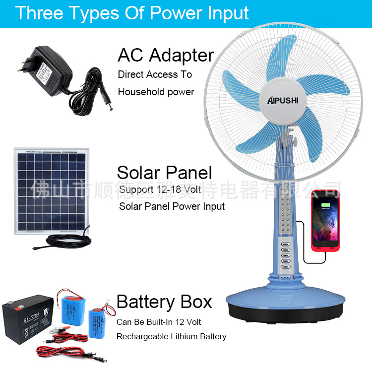 Трафик DC 12V Солнечная энергия аварийная вентилятор 5 Leaf 1618 -INCH 5 LEAF Большой объем ACDC с зарядным вентилятором USB фонаря