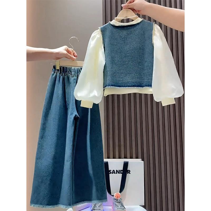 Детский комплект, осенняя куртка, приятные телу джинсовые штаны, осенний, в корейском стиле, 3 предмета