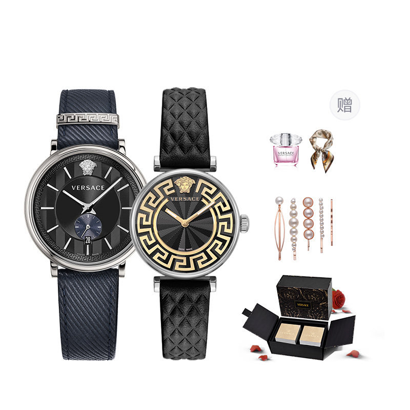 VERSACE Versace, кварцевые часы, кожаный ремешок для часов, синий циферблат подходит для мужчин и женщин, браслет с одной бусиной, подарочная коробка, аксессуар, заколка для волос, духи для влюбленных, кварцевый механизм, легкий роскошный стиль