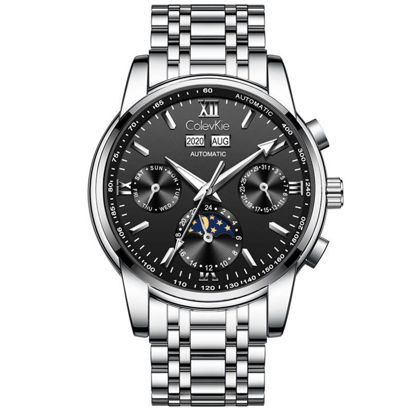 Швейцарские часы, мужские часы, высококачественный водонепроницаемый универсальный календарь, автоматический механический механизм, ремешок для часов из нержавеющей стали, черный циферблат, стальной ремешок, подарочная коробка, легкий роскошный стиль