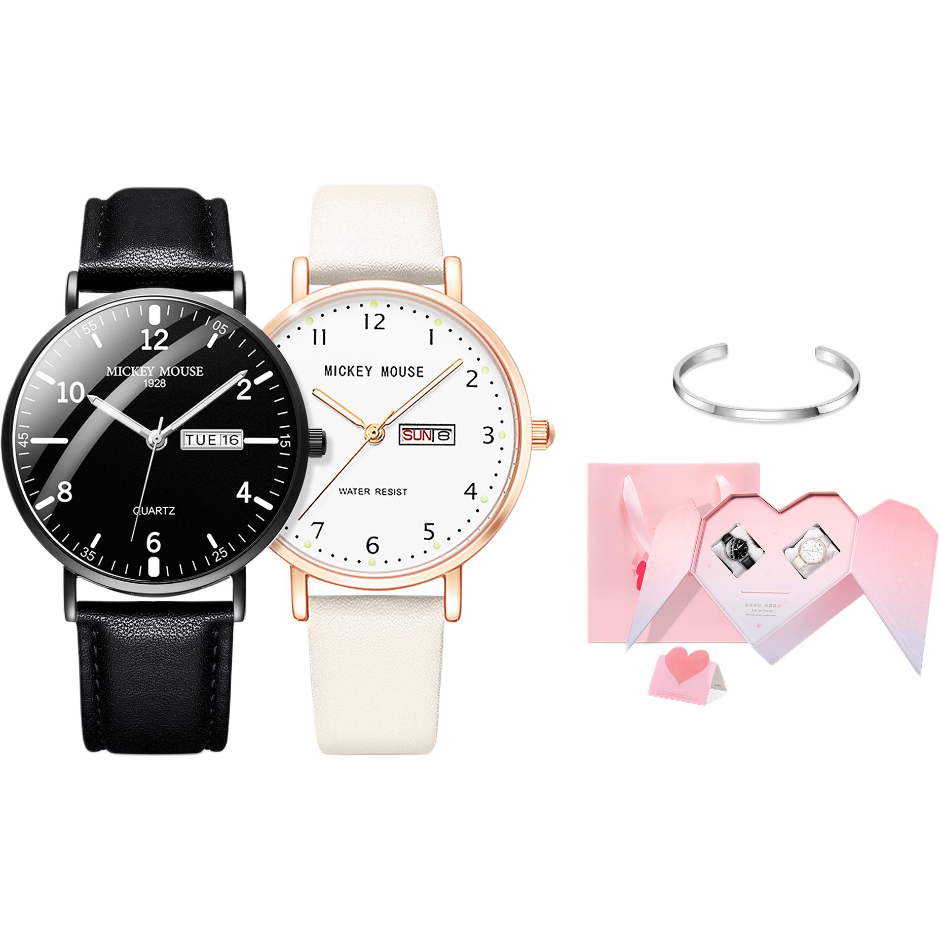 Disney Дисней, модный классический трендовый кварцевый календарь, черный циферблат подходит для мужчин и женщин, универсальные памятные парные часы для влюбленных, подарочная коробка, комплект, простой и элегантный дизайн, кварцевый механизм