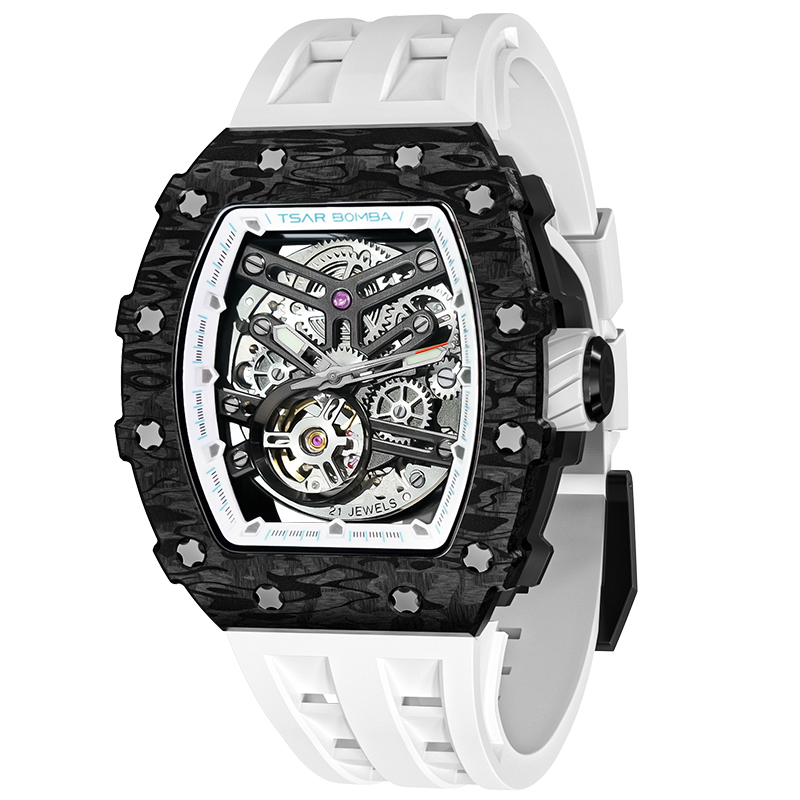 [BONEST GATTI布加迪 时尚潮流百搭腕表 酒桶型夜光防水镂空手表 机械机芯 橡胶表带 国表 男表 黑色表盘 BG9920-A]