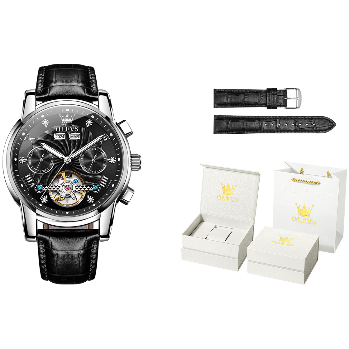 [欧利时 OLEVS 玩酷系列 时尚百搭男士手表男款 礼盒装 机械机芯 皮革表带 国表 男表 黑色表盘 OLS-7088-1]