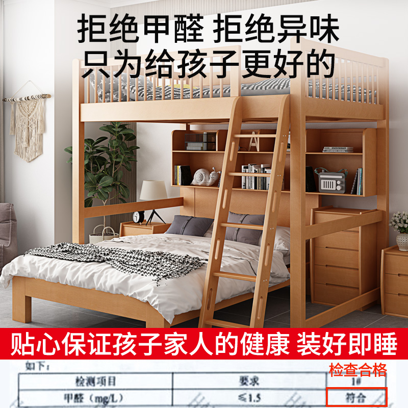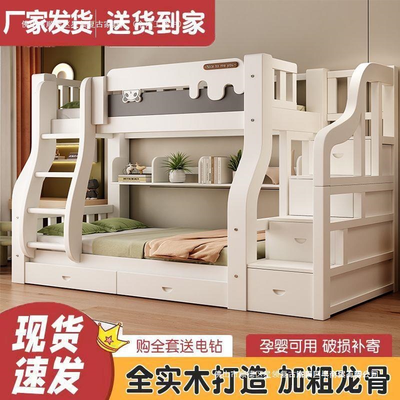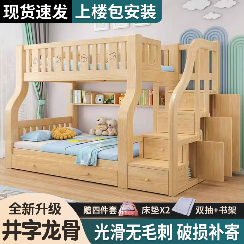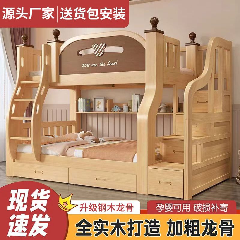 Новая сплошная древесина ложится двойной кровать -слой для матери, утолщенная двухслойная высокая и низкая кровать с двуспальной кровать