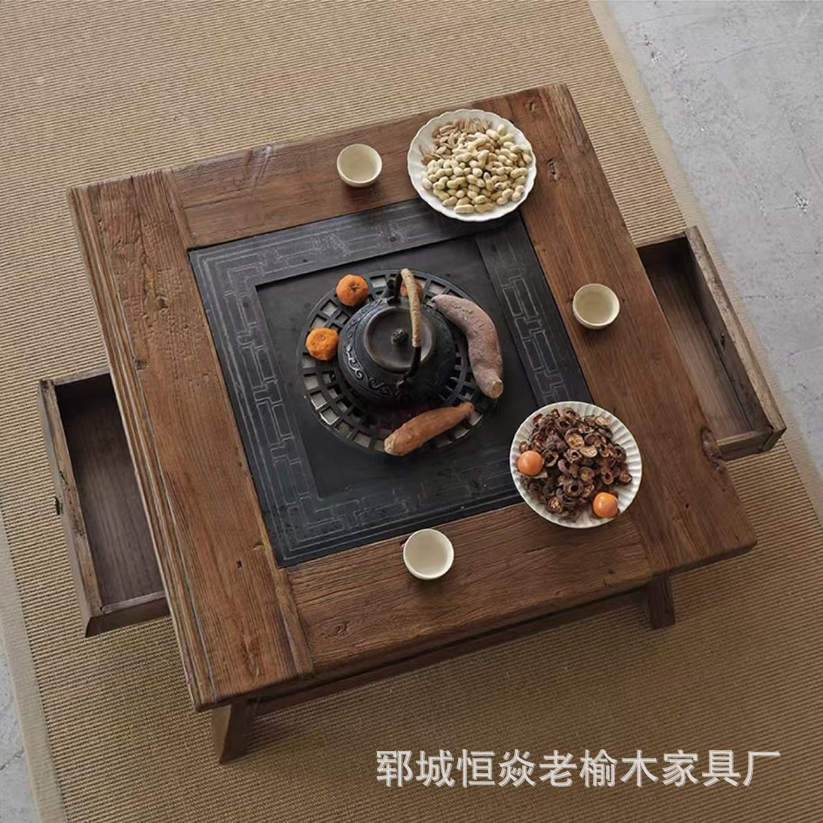 Ретро Старый Вяз Открытие горячего горшка Стол с твердым лесом расщепляющий дрова Двивдеса во дворе железного горшка тушеное горячее горшок с горячим горшками и стулом