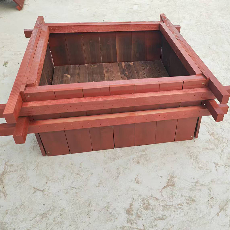 Цветочная коробка антикоррозии дерева, открытая квадратная цветочная и трава, посадка посадка, придорожная улица с твердым деревом.