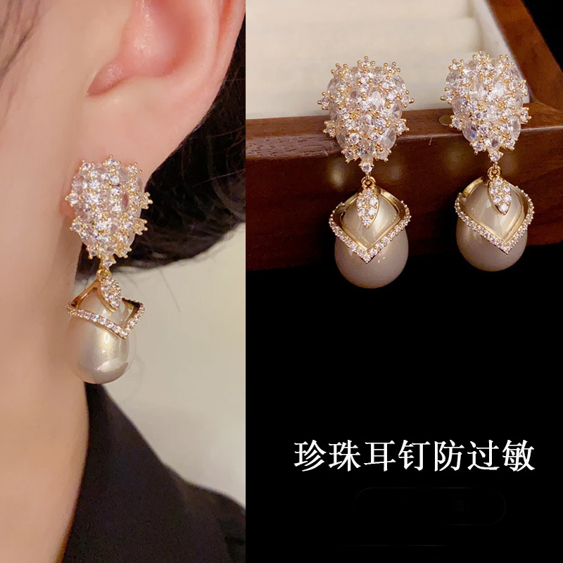 Серебряная игла, блестящий цирконий из жемчуга, ретро серьги, серебро 925 пробы, французский стиль, цвета шампанского, легкий роскошный стиль
