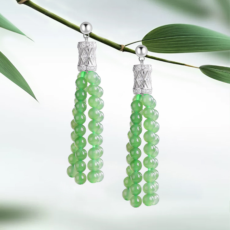 Натуральная яшма из старинного материала из нефрита, серьги с кисточками, серебро 925 пробы, яркий броский стиль