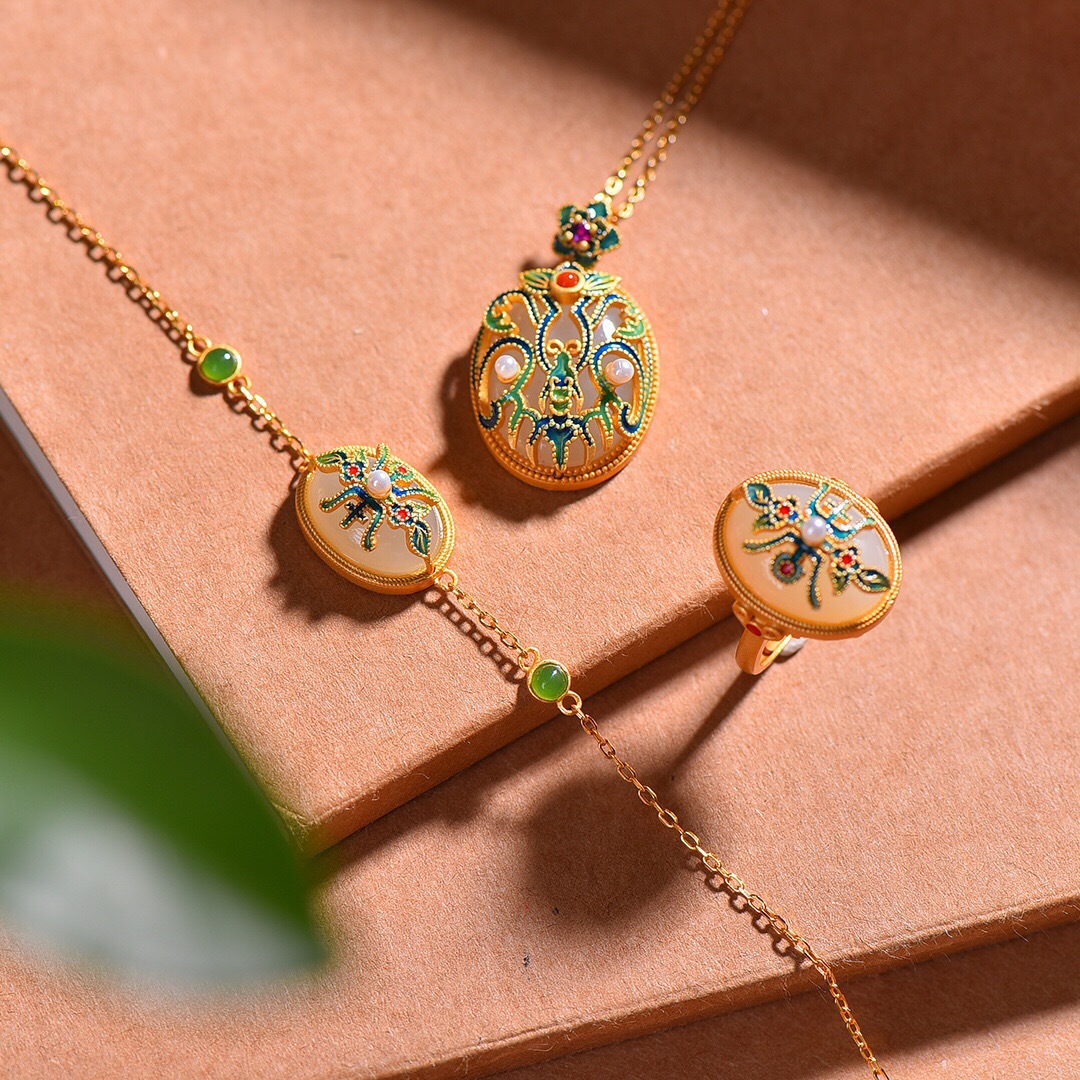 Подвеска из белого нефрита, кольцо, браслет, эмаль, комплект, серебро 925 пробы, 3 предмета