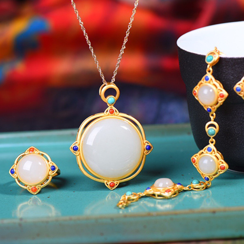 Инкрустация камня из нефрита, подвеска из белого нефрита, серьги, ретро браслет, комплект, серебро 925 пробы, простой и элегантный дизайн