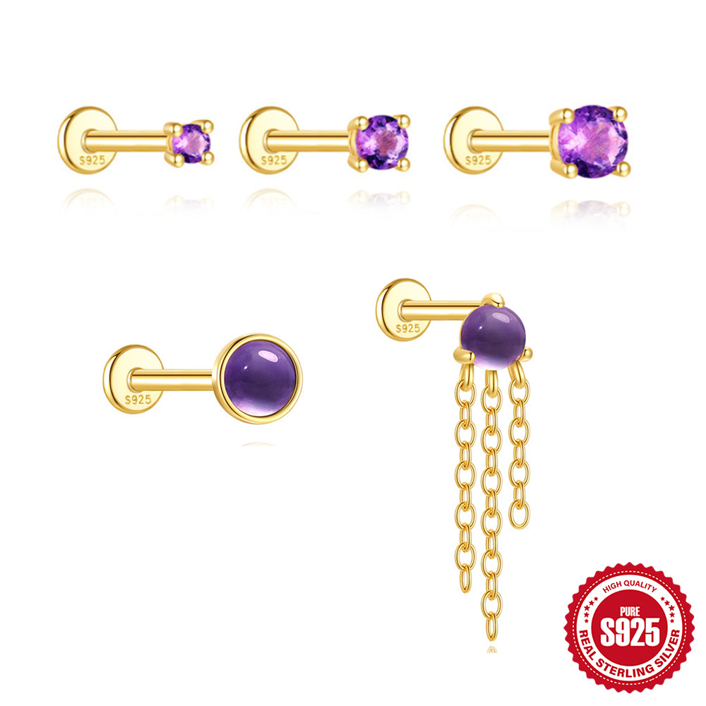 Натуральный пирсинг с аметистом, серьги, серебро 925 пробы, легкий роскошный стиль, в корейском стиле, яркий броский стиль