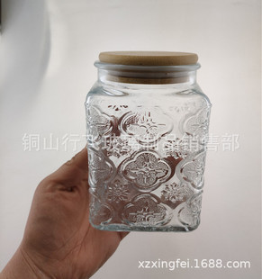 Ретро -бегония рельефная стеклянная квадратная банка, бутылка чая с бамбуковой крышкой, прозрачный стеклянный бак конфеты.