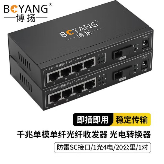 博扬 Гигабитный одномодовый однокомнатный оптический волоконно-преобразователь преобразователь SC Port 1 Оптический 4 Электрический By-VG1041A/B-20 км