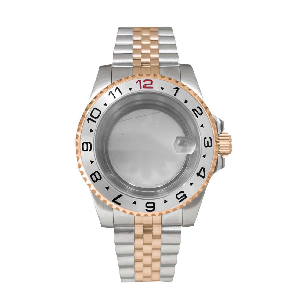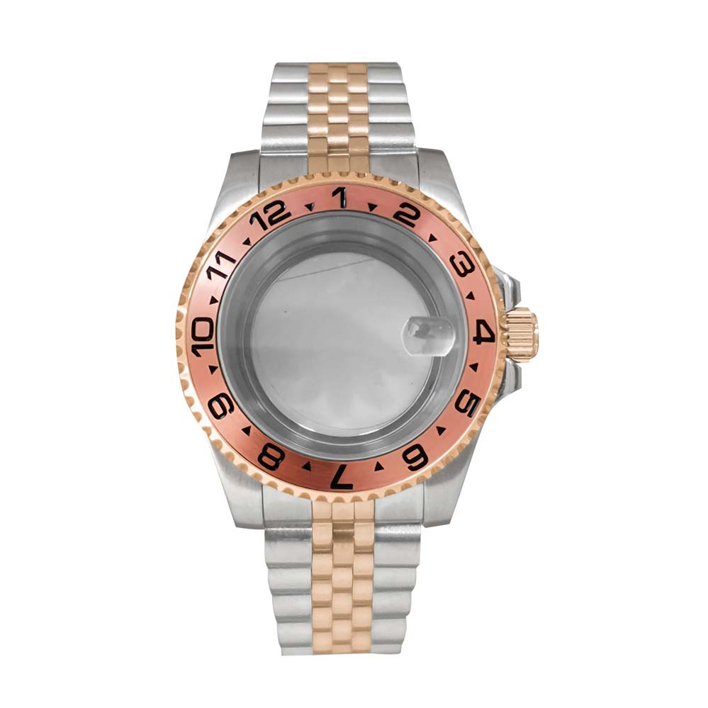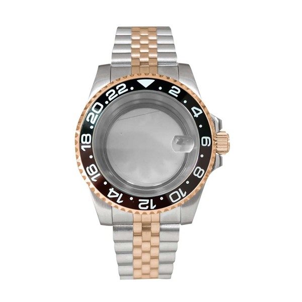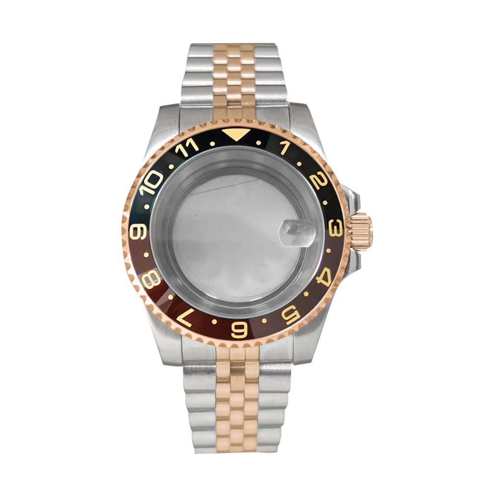 15-Jianmei прозрачный нижний корпус + сапфировое увеличительное стекло + ремень на пять бат + розовая надпись GMT и черное темно-коричневое кольцо